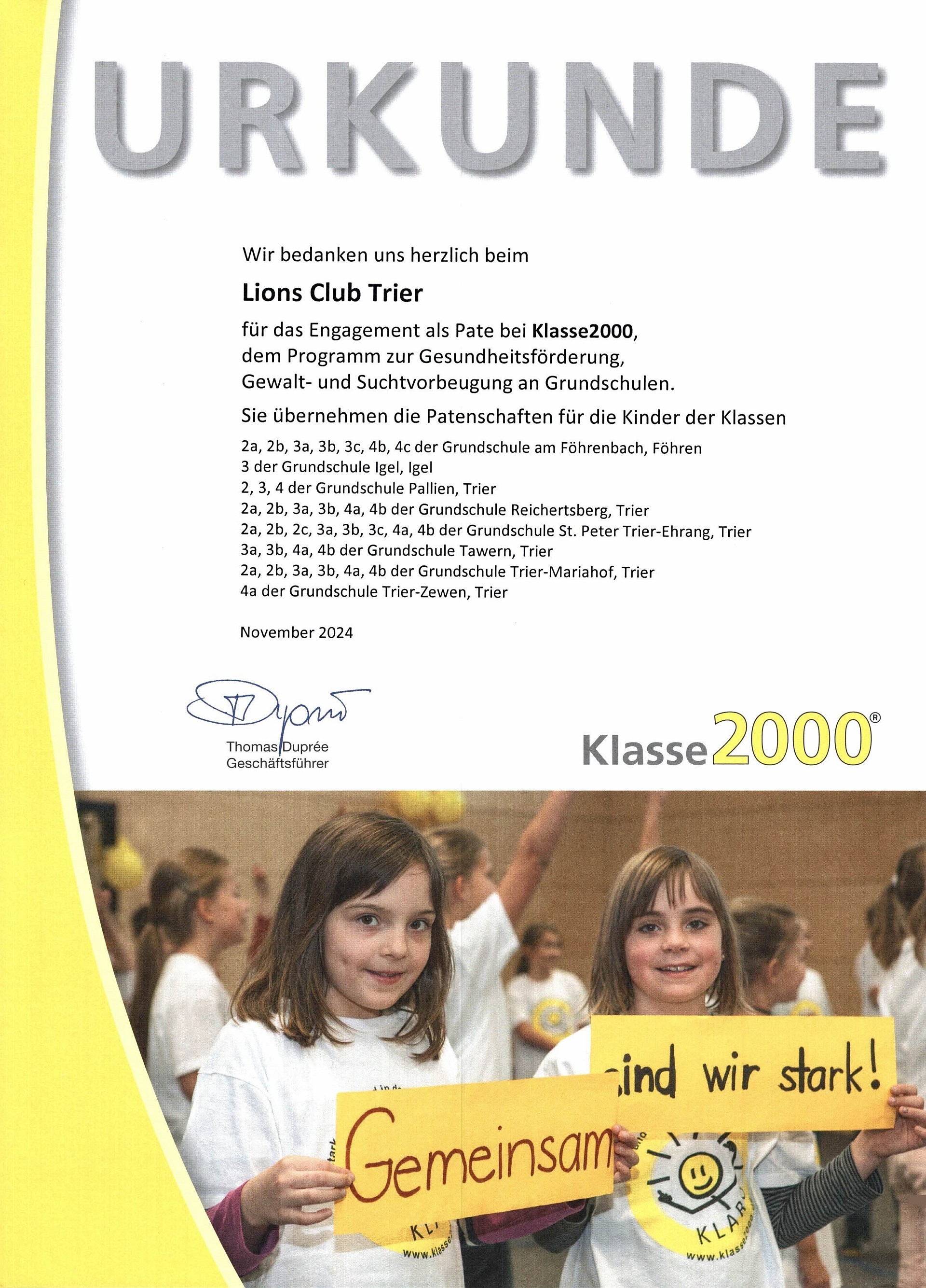 Der Lions Club Trier erhält im November 2024 die Urkunde für das Engagement als Pate bei Klasse2000, dem Programm zur Gesundheitsförderung, Gewalt- und Suchtvorbeugung an Grundschulen. Der Lions Club Trier übernimmt hier Patenschaften für die Kinder der Klassen: